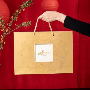 Hộp quà thiết kế tông màu vàng sang trọng với những họa tiết dập nổi tinh tế. Bên trong có khay lót, kèm theo túi và thiệp chúc để gửi yêu thương tới mẹ, người phụ nữ trân quý.
